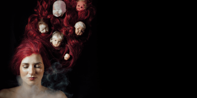 Die Schauspielerin Luise Friederike Hennig am linken unteren Bildrand mit geschlossenen Augen und roten Haaren vor einem schwarzen Hintergrund. In ihren langen Haaren sind 6 verschiedene Puppenköpfe. Foto: © Anna Kolata | Zuschnitt: Radio Corax.
