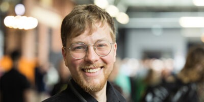 Thomas Laschyk bei der re:publica 2024. Er hat dunkelblonde mittellange Haare und Bart und eine große runde Brille und lächelt in die Kamera. Im Hintergrund und unscharf eine Halle mit Lichtern und Menschen. Foto: Martin Kraft | Zuschnitt: Radio Corax. (CC BY-SA)